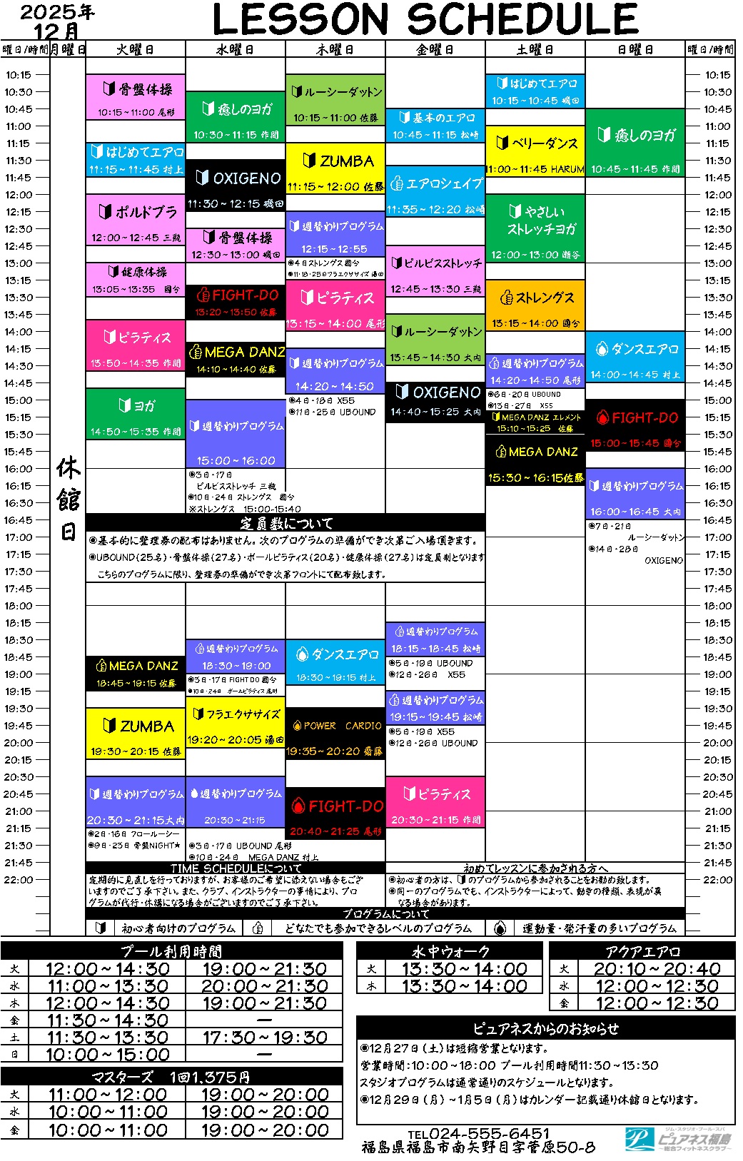 日頃よりピュアネス福島をご利用いただき誠にありがとうございます。フィットネスカレンダー記載の通り11月16日(日)~11月19日(水)まで休館となります。大変ご迷惑をおかけしますが、ご理解とご協力のほどよろしくお願いいた…続きを読む