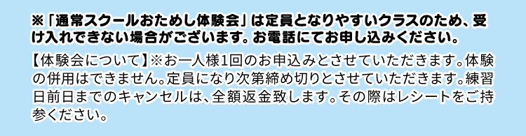 ※お一人様1回のお申込みとさせていただきます。体験の併用はできません。定員になり次第締め切りとさせていただきます。練習日前日までのキャンセルは、全額返金致します。その際はレシートをご持参ください。